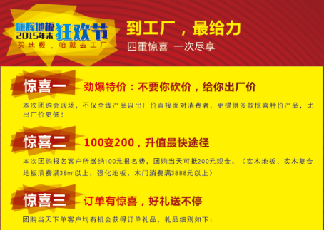 2015年康輝地板歲末聚惠團(tuán)購(gòu)風(fēng)暴來(lái)襲,買(mǎi)地板咱就去康輝地板工廠!走進(jìn)地板的起始之地,尊享貼心的貴賓服務(wù),最主要的是,優(yōu)惠!優(yōu)惠!還是優(yōu)惠!!跟隨我們的免費(fèi)大巴花一天,省下您好幾個(gè)月的工資,心動(dòng)不如行動(dòng),趕緊來(lái)呦,我們已準(zhǔn)備好給你驚喜......