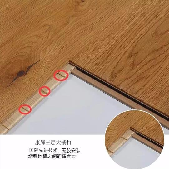 康輝新三層實木地板采用康輝獨家雙鎖扣技術,實現(xiàn)了免釘、免膠、免龍骨安裝,是一種最快速、最節(jié)約、最環(huán)保的方式,還可以重復拆裝,反復應用。