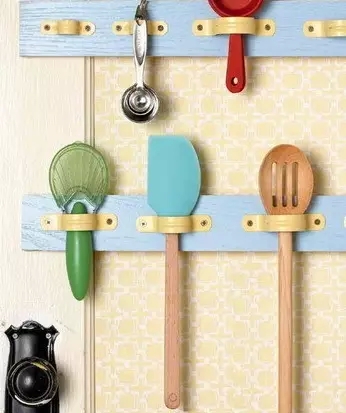 把噴涂電鍍管卡固定到墻面上的小板條上,可以代替在櫥柜墻面上安裝金屬拉籃。櫥柜上方的墻面是你天天能看見的儲物空間,烹飪時隨手會用到的小工具都可以懸掛于此,不僅方便尋找,還能成為廚房一景。