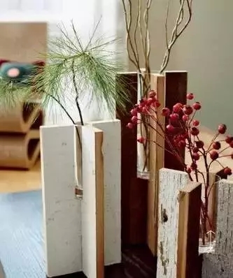 舊木板切割出凹槽,相互拼插而成。凹槽的深淺、寬度不同,所容納的圓柱體花瓶的高度和維度也就不一樣,不過為每個凹槽多預(yù)留出0.3cm的富余,這樣花瓶可以更容易地插進去。